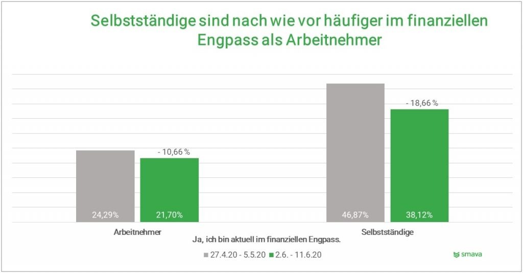 Vor den Lockerungen des Lockdowns waren knapp die Hälfte der Selbstständigen (46,9 %) wegen Corona in einem finanziellen Engpass. Aktuell gilt das noch für gut ein Drittel (38,1 %). Die häufigsten Gründe für einen finanziellen Engpass bei Selbstständigen bleiben weiterhin eine schlechte Auftragslage (19,6 %) und temporäre Geschäftsschließungen (6,4 %).