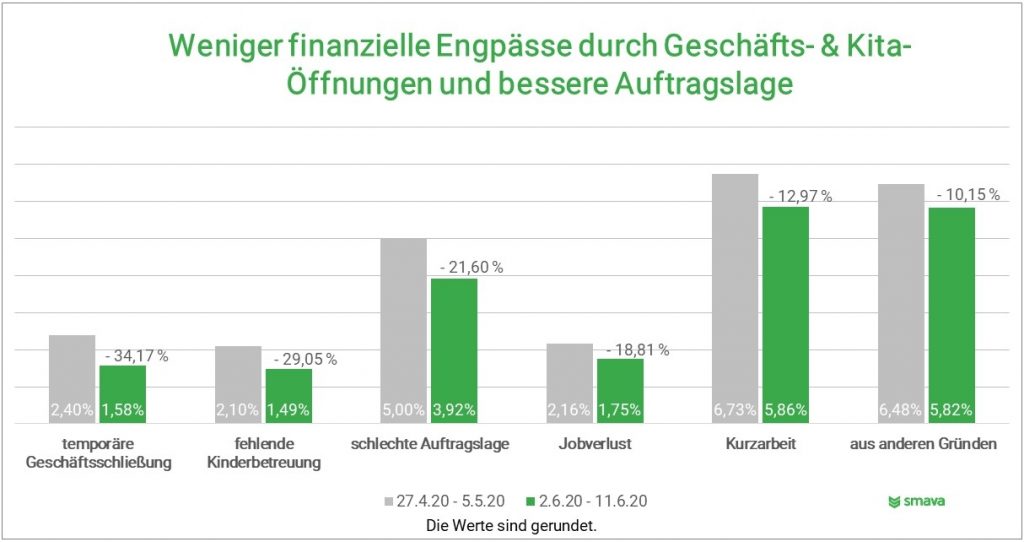 Weniger finanzielle Engpässe durch Geschäfts- und Kita-Öffnungen und bessere Auftragslage