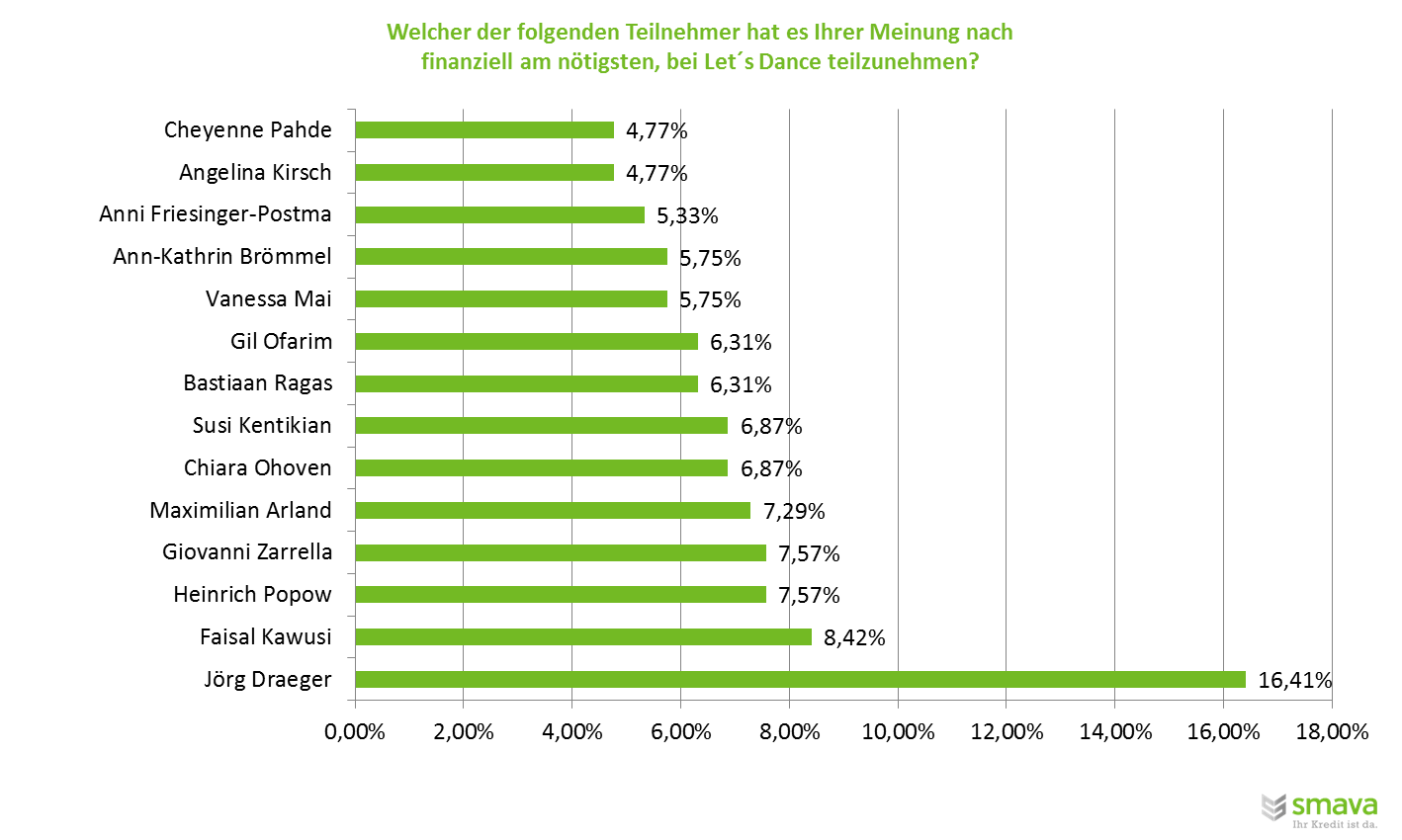 Am 17. März startet die Jubiläumsstaffel von Deutschlands beliebtester Promi-Tanz-Show „Let’s Dance“. 14 Prominente präsentieren in 12 Live-Sendungen ihre Tanzkünste. Eine Jury bestehend aus Joachim Llambi, Motsi Mabuse und Jorge González sowie das Publikum übernehmen die Bewertung und werden den Sieger bestimmen. Ein Sieger steht bereits jetzt fest. Sängerin Vanessa Mai ist die kreditwürdigste „Let’s Dance“-Teilnehmerin – 29,55% der befragten Anleger würden ihr Geld leihen. Auf Platz zwei landet die Schauspielerin Cheyenne Pahde mit 12,34% der Stimmen, dicht gefolgt von Ann-Kathrin Brömmel (10,23%), der Freundin von Mario Götze. Das ergab eine Umfrage* des Kreditvergleichsportals smava. Bastiaan Raagas, dem ehemaligen „Caught in the Act“-Sänger und Chiara Ohoven, dem deutschen Society-Girl, würden hingegen nur 1,62% beziehungsweise 1,14% der befragten Anleger Geld leihen. 16,41% der Befragten sind der Meinung, dass der TV-Moderator Jörg Draeger es von allen Kandidaten finanziell am nötigsten hat, an „Let’s Dance“ teilzunehmen.